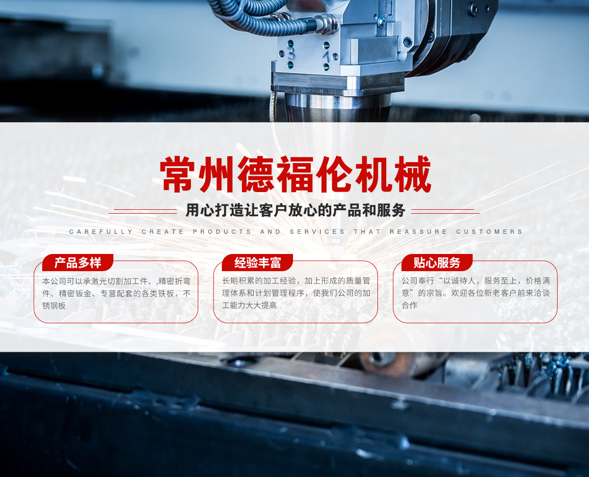 常州德福倫機(jī)械有限公司成立于2014年12月19號(hào),位于江蘇省常州市武進(jìn)區(qū)遙觀(guān)鎮(zhèn)建農(nóng)村劍童路56號(hào)西門(mén);公司配備;1萬(wàn)瓦通K激光切割機(jī)1臺(tái),6千瓦領(lǐng)C激光切割機(jī)1臺(tái);機(jī)器行程6米*2.2米,切割不銹鋼50mm,碳鋼30mm;300噸大型數(shù)控折彎?rùn)C(jī)。精密焊接機(jī)器數(shù)臺(tái)。本公司可以承激光切割加工件、,精密折彎件、精密鈑金、專(zhuān)營(yíng)配套的各類(lèi)鐵板,不銹鋼板。長(zhǎng)期積累的加工經(jīng)驗(yàn),加上形成的質(zhì)量管理體系和計(jì)劃管理程序,使我們公司的加工能力大大提高,滿(mǎn)足客戶(hù)所需,是我們公司的目標(biāo)!公司奉行“以誠(chéng)待人,服務(wù)為上,價(jià)格滿(mǎn)意”的宗旨。歡迎各位領(lǐng)導(dǎo);老總前來(lái)洽談合作!